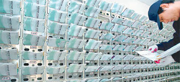 一位邮递员于4日下午在首尔钟路区母岳洞现代楼,把选举管理委员会发送的第18届总选投票介绍投入各家庭的邮箱里。