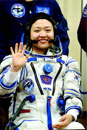 韩国最初宇宙人李昭娟8日登上有人宇宙船前,穿着宇宙服满面笑容地向自己的家族和参观团举手致敬。
