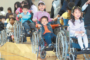 在残疾人日(20日)前夕,幼儿园的孩子们开展了体验残疾人的活动。16日,在釜山沙上区庆南情报大学的体育馆中举行的残疾人体验活动。这一天参加此活动的幼儿园小朋友亲身体验了残疾人坐轮椅的种种不便。