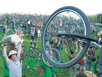 22日“地球之日(Earth Day)”前夕,21日在匈牙利布达佩斯举行的鼓励利用亲环境自行车的“Critical Mass”活动中,参加活动的人们纷纷将自行车举到了头上。Critical Mass是物理学的术语,表示“临界质量”,指的是引起某种变化所需的量。当天的活动中,有数万名的自行车爱好者参加了。在左侧代替自行车而高举孩子的参加者尤为显眼。