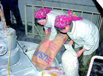 专家观测,自从美国表示下个月开始向朝鲜支持50万吨粮食后,朝美关系将会有可视化进展。2005年朝鲜女性正向粮食仓库转移“USA”标志明显的美国粮食麻袋。