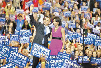 民主党参议员奥巴马于3日晚,在明尼苏达州圣保罗宣布得到民主党选举胜利后,携夫人米歇儿一起迎接支持者们的欢呼。当天在最后一次初选的蒙大纳州和南达科他州宣传的奥巴马,得到超级大议员们的高支持率,得到了为成为民主党候选人的大议员2118名。