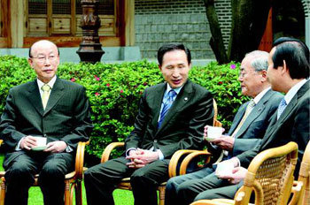 7日,李明博总统邀请基督教元老到青瓦台,并和他们共同交换了牛肉风波等对政局现案的意见。从左起赵镛基汝矣岛纯福音教会元老牧师、李总统、金宣纛光临教会元老牧师、严信亨韩国基督教总联合会会长。