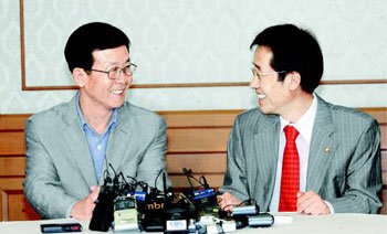 大国家党洪准杓院内代表(右)和统一民主党元惠荣院内代表,12日在国会贵宾餐厅共进早餐, 讨论了2个小时牛肉政局突破方法。 这是18大国会开完以后,两个政党的院内领导人第一次进行的正式会谈。