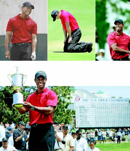“高尔夫皇帝”泰格•伍兹(33岁•美国)艰苦作战后终于举起了US公开赛的银制冠军奖杯。