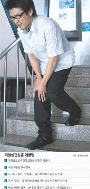 公司职员洪形哲(29岁,首尔瑞草区瑞草洞)一年前踢足球时伤到了右膝盖。因为巨烈疼痛加上膝盖红肿在汉医院打了针,病痛似乎好起来了。但是后来每次运动或爬山时都感到很痛。在医院检察的结果表明膝盖关节软骨受损需要动手术。这是由于忍着痛不去医院造成的。