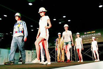 30日,在首尔江南区三星洞贸易中心开幕的2008国际安全保健展示会上,模特们正穿戴各种安全装备进行时装秀。展示会将持续到3日。