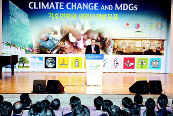 4日是潘基文联合国秘书长访韩的第二天。在首尔汝矣岛国会议员会馆大会议室中,他正以《气候变化和新千年开发目标》为主题进行演讲。18代国会任期开始虽然已过一个多月,但是因执政党与反对党的对峙,国会仍未开院。因此,潘秘书长只好不能在国会本会议室中进行演讲。