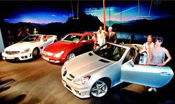 韩国梅赛德斯奔驰21日在首尔中区奖忠洞新罗酒店以“梦想汽车”为主题,展示了新的三种车型。从左起为New Generation“SL 63AMG”, “CLS350”, “SLK350”。
