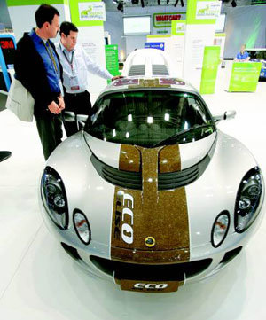 22日(当地时间)在英国伦敦召开的“英国国际车展”上,游客们正在参观莲花汽车公司的“Elise Eco”。这辆车以赛车埃里斯的设计为基础,用再生铝罐和天然纤维制成,车顶上还带有提供电力的太阳能电池。