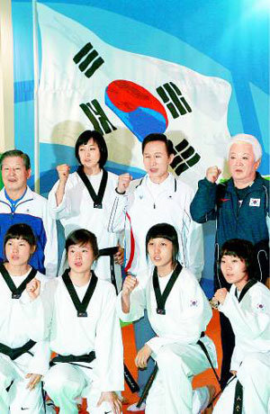 李明博总统(后排右)14日访问了首尔太陵选手村,激励了将在下个月参加北京奥运会的跆拳道国家代表队选手,与选手们一起高喊“加油”。
