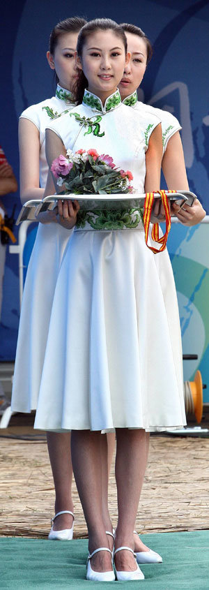 31日,在北京奥运会射箭赛场举行的颁奖仪式彩排中,礼仪人员拿着奖牌和花环进场。韩国的目标是在本次大赛中获得全部四枚金牌。