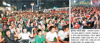 清溪广场改变了。随着2008北京奥运会的开幕,曾挤满清溪广场的蜡烛示威队(右)消失了,观看奥运会比赛的市民聚集到了广场。来到清溪广场的市民们正看着大屏幕为韩国选手加油。