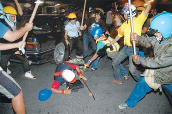 2日凌晨在曼谷大街上,亲政府示威队(中间)被反政府示威队包围,正在接受私刑。当日发生流血事件后,泰国政府正式宣布了曼谷正处于紧急状况。