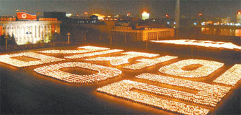 9日,朝鲜迎来了建国60周年国庆节。参加庆祝活动的人们用火把刻出了国防委员长金正日的名字。但是,金委员长没有参加阅兵式以及其它所有活动。金正日健康状况出现异常的说法正在进一步扩散。这张照片是朝鲜中央通讯社先发布给东京,然后再通过美联社传送过来的。