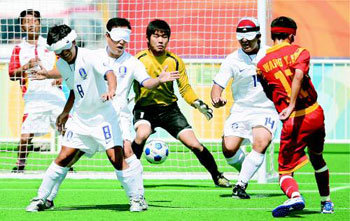 11日,在北京奥林匹克公园曲棍球场召开的韩国对中国的五人制视力残疾足球比赛中,韩国队正在防守中国队王亚鹏(右边)踢的球,球里面有发声的铁球,韩国队以0:1输给中国队,记录了3连败的成绩。