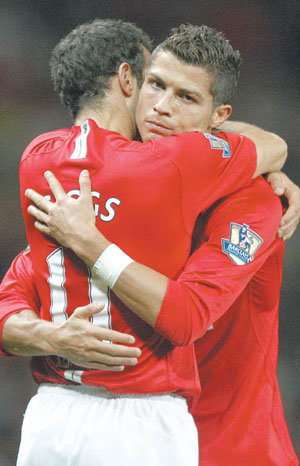 前半场第25分,射进头球的克里斯蒂亚诺•罗讷尔多(右侧)拥抱了用角球助攻的威尔逊,并向他表示了感谢。曼联--AP联合新闻