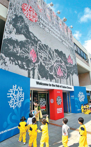 今年是釜山国际电影节第十三周年。2日开始到10日为止,釜山将成为电影世界。为了2日的开幕仪式,在釜山帆船赛场野外上映馆入口设置了大型指示牌。孩子们正用惊奇的目光注视着指示牌。