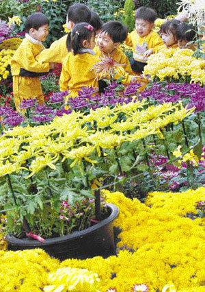 13日,在首尔瑞草区市政厅广场举行了“菊花展览会”。一群幼儿园的小朋友们正在愉快地观赏菊花。此次展览将延续到17日,现场可以观赏到利用菊花摆设的韩半岛、红心等30多种景致。此外,现场还设立了菊花销售点,市民可以在这里购买到廉价的菊花。