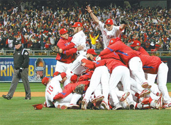 30日,费城选手们以4胜1败的成绩战胜了坦帕湾队,得到了时隔28年的美国职业棒球世界系列冠军。图为费城选手们在球场上欢呼庆祝。