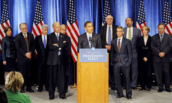 7日在芝加哥,巴拉克•奥巴马美国总统当选人(第一排中间)召开了首次记者招待会。约瑟夫•拜登副总统当选人双手交叉抱在胸前、伊曼纽尔白宫馆秘书长(内定)把手放入裤兜,站在当选人的旁边。第二排从左到右依次为前总统经济顾问泰森、前民主党下院议员戴维、前美国财政部长罗伯特•鲁宾、密歇根州大使珍妮弗、前联邦准备制度理事会议长保罗•沃尔克、时代华纳CEO理查德德•帕森斯、施乐公司会长安妮•马尔卡希、前美国财政部长官萨默斯。