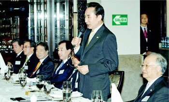 20日(当地时间),秘鲁访问中的李明博总统(右起第2位)正在利马赛乐顿饭店召开的经济使节团晚餐会上致词。