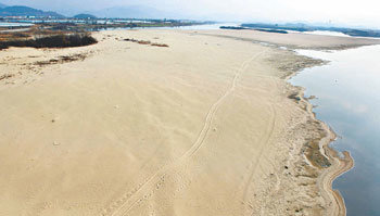 庆南密阳市水山桥下,洛东江河流被堵塞后,逐渐成了沙漠。政府15日表明,为了改善水质、确保水量、预防洪水等,明年将正式开始推进四大江河整备事业。