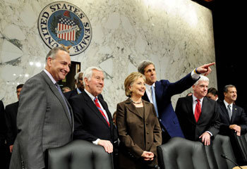 13日,美国华盛顿议事堂召开了听闻会议,出席听闻会的希拉里国务长官候选人正在与上院议员进行交涉。从左到右是美国民主党参议员舒默、共和党首席资深议员鲁嘉、国务长官候选人希拉里、上院外交委员长约翰•克里、上院金融委员长克利斯托夫。