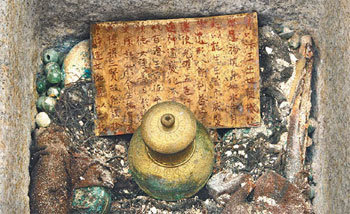 在修建国宝11号全北益山弥勒寺石塔时,被发现的金制舍利奉安记(上)和金制舍利壶。金制舍利奉安记上,记载了百济武王的王妃不是新罗真平王的女儿善花公主,而是百济贵族沙宅积德的女儿。