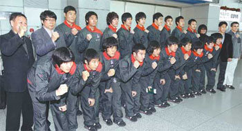 “为了连续7次参加世界杯正式赛!” 下个月11日要与伊朗进行2010年南非共和国世界杯亚洲最终预选赛第4次比赛的足球代表队29日在仁川国家机场再次确认了获胜意志。以2胜1平的成绩位居小组第一的国家队2月1日将在迪拜对战叙利亚、2月4日对战巴林、6日进军伊朗德黑兰。韩国在与伊朗队的历代比赛成绩是8胜5平8平,但是在客场比赛中是1平2负,重来没有赢过。代表队教练许丁戊(后排,左)表明了“制造新的历史”的必胜意志。