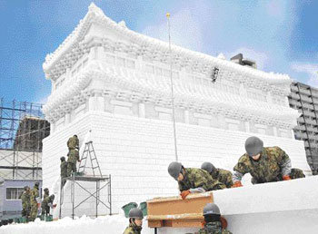 2日,日本自卫队队员们正在用雪制造去年因火灾烧毁的韩国崇礼门。将在5日开幕的世界观光会北海道“第60届雪花活动”中的“雪崇礼门”,是实际崇礼门的5分之4,前面将挂有韩国与日本的国旗。当初日本方考虑到韩国的情绪,保留了该计划,但是因为驻日使馆的积极邀请,重新进行了该冰雕的雕刻。