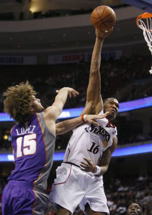 10日,费城76人队的马利斯•斯贝茨(右侧)躲开了菲尼克斯太阳队罗宾•洛佩斯的防守,接着罐篮。当天,费城76人队以108比91击败菲尼克斯太阳队。