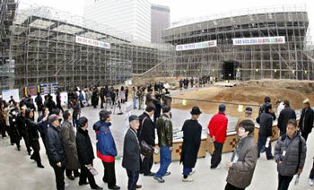 10日,政府对外开放了崇礼门的修复现场,市民正在观看现场。这一天,5800多名市民参观了崇礼门,表示了人们对崇礼门的关怀。崇礼门全面的修复工程将从2010年开始,预计将于2012年完成所有修复工程。