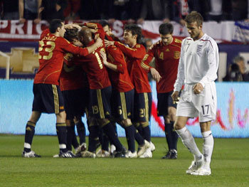 英格兰国家代表队的戴维•贝克汉姆,12日在西班牙塞维利亚举行的与西班牙的友谊赛中,以0比2败北后,以失落的表情走出了球场。这与西班牙选手们高兴的表情形成鲜明的对比。