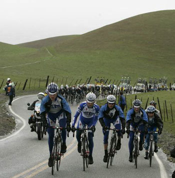 本月18日,在美国加州召开“加州巡回”路面单车大赛。从圣何塞州至莫堤斯城,总长达167公里的3区间赛事上,选手们正爬着坡。雷菲默(Levi Leipheimer 美国)共花费13小时51分钟14秒位居领先,而在大赛中单车被盗的“路面霸王”蓝斯•阿姆斯特朗(美国)则落后冠军40秒,仅居第四。