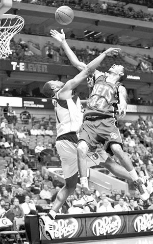 新泽西蓝网队的哈里斯(右)在与达拉斯小牛队进行客场比赛时,试图打进一个扣篮,却遭遇了对方的赖特。达拉斯以113比98取胜。