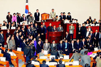 两党达成一致后,院内代表洪准杓向聚集在国会会议场的议员公布了交涉结果。
