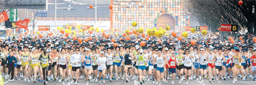 首尔国际马拉松大会有望成为世界前10位赛事。首尔国家马拉松大会只要在今年产生1个女子纪录(2小时10分30秒以内)就可以被国际田径联盟选为“金标大会”。图为去年大师赛参赛者们在首尔锺路区世宗路李舜臣将军铜像前面出发。