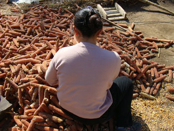 脱北女性J某脱北后,正在中国河北省农村的自家院子里收拾玉米。J某因被拐卖,与中国农村男子生活在一起。