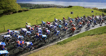 道路自行车比赛2009自行车比赛的选手们,29日在第一区间(蒙特勒—费里堡,176.2km)进行角逐。围绕瑞士山涧地区和湖畔进行5个区间672.2km的本次大赛将持续到3日。