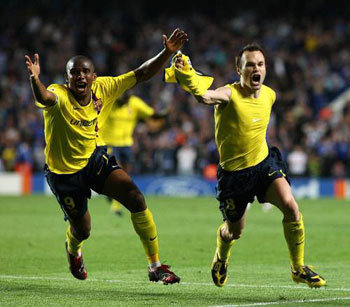 巴塞罗那的前锋伊涅斯塔(右)在0比1落后的后半场比赛即将结束之际,用中距离射门将比分扳平(如图),正与队友埃托奥在球场上奔跑表示庆祝。