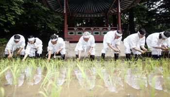 现代建设总经理金中兼(左数第三)及员工正于本月3日,在首尔昌德宫清漪亭前的水田插秧。现代建设从2006年开始进行文化财产守护活动,并每年在朝鲜时代帝王亲自耕田的昌德宫,例行插秧活动。