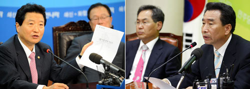 18日,大国家党安尚秀院内代表(左边)和民主党李康来院内代表在各自召开的最高委员会议和高位政策会议中,互相推脱6月份临时国会推迟的责任。