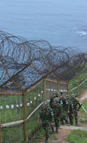 21日,陆军栗谷部队的将兵们正在巡查江原道固城的民统线(民间人进出统制线)以北的海岸铁栅地区。