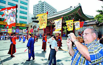 随着24日拆除前总统卢武铉焚香所,德寿宫的大汉门重新向市民开放。25日,为观看守门将交代仪式,来自国内外的游客们聚集在大汉门前。