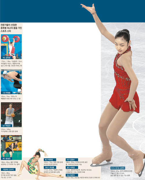球类项目上,高个子球员被评为拥有理想体型。河升镇(24岁•KCC)被评为拥有篮球界百年不遇的出色体型。拥有作为亚洲人难得的高身高(220厘米)的同时,上下半身比例很均衡。排球选手文圣民(23岁•安卡拉 HALK BANK)虽然身高(198厘米)没有河升镇高,但其犹如橡皮球般的弹跳力却是首屈一指。从长腿和细脚踝爆发出的高击球点,使他成为世界明星。足球方面,同时具备爆发力和速度的朴周永(24岁•AS摩纳哥)被选为最理想体型。