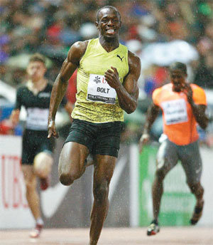 8日,“闪电”先生博尔特(23岁•牙买加),正在瑞士洛桑举行的国际田联超级大奖赛200米决赛中飞驰着。博尔特以19秒59——历届第4的成绩摘得冠军。