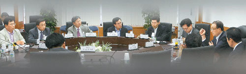 为了应对分布式拒绝服务(DDoS)攻击,媒体通信委员会—ISP企业社长团紧急会议于9日在首尔钟路区世宗路媒体通信委员会大厦召开。媒体通信委员会委员长崔時仲和社长团成员们正在用严肃的表情讨论对策。