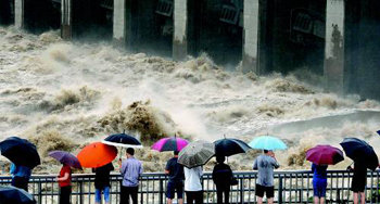 12日,首尔京畿地区发出豪雨警报,暴雨突袭。因此,北汉江水坝一律都打开水门开始调整水位。市民们正观看北汉江八堂水坝打开10个水门排水的场面。