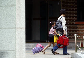 京畿道小学陆续出现甲型H1N1流感的感染患者,这导致集团感染的可能性非常高。为了防止感染甲型H1N1流感,很多小学都提前放了暑假。一名学生正牵着父母的手出校门。